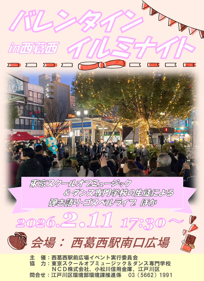 東西線西葛西駅南口に設置されたステージで、イルミネーションの点灯式および東京スクールオブミュージック&ダンス専門学校の学生と、今注目のアーティストによる演奏を行います。